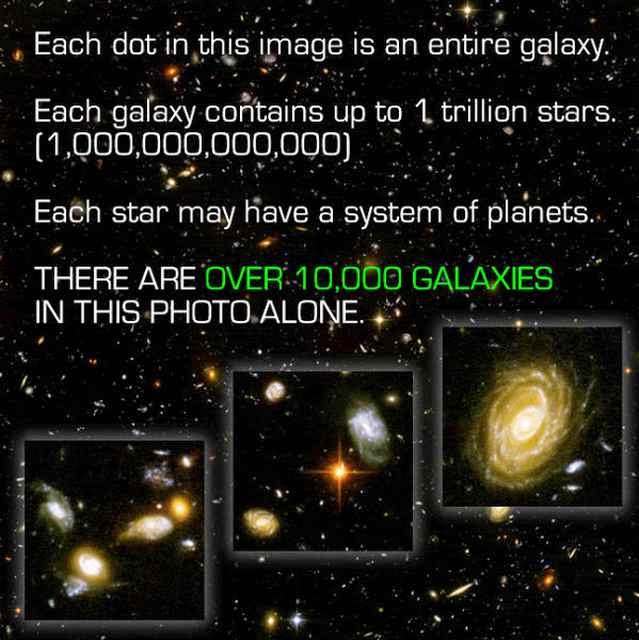 The small green square in the photo to the left, a brief, single snapshot in time—what appears to be only a cold, empty void of absolute darkness, with nary a single star to be seen by the naked eye—in fact contains within the dark confines of its hazy boundaries the luminous wonders of over 10,000 beaming galaxies, each shining with the light of a trillion suns.